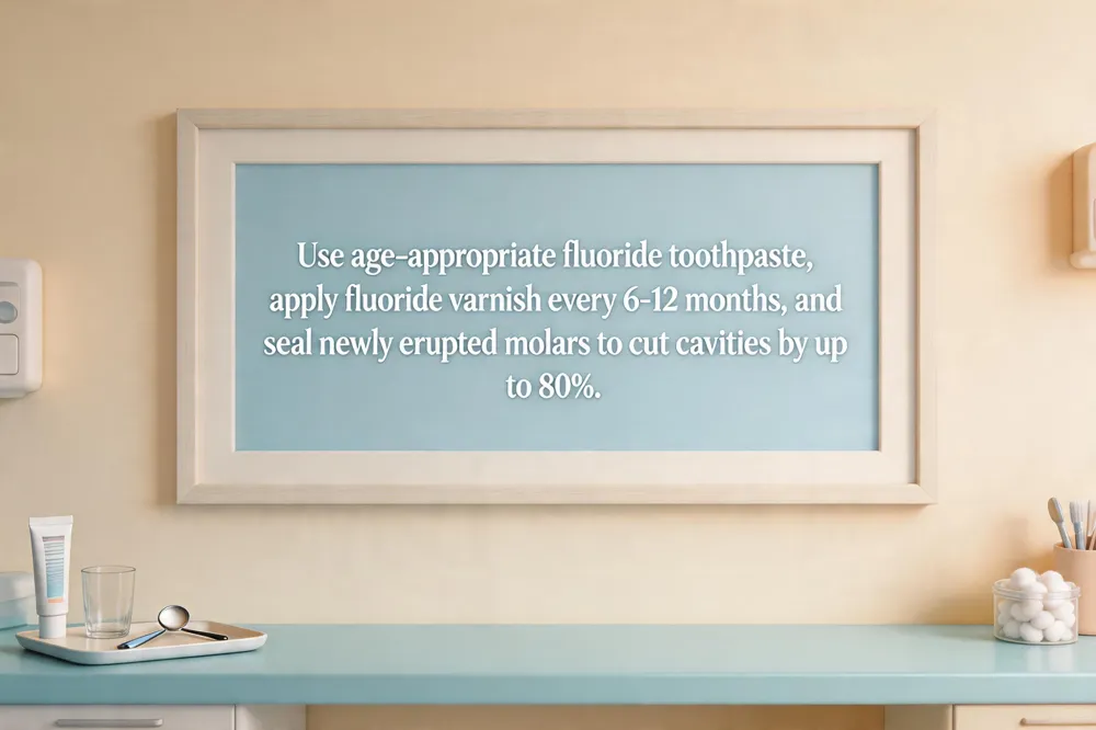 A bright smile starts with the right amount of fluoride toothpaste. For children under 3 use a smear the size of a grain of rice; from ages 3‑6 a pea‑sized dab is ideal, and continue that size until they can reliably spit, usually by 7‑8 years. Our office applies fluoride varnish—a safe, professional coating that cuts cavities by roughly 30 % in primary teeth—every 6‑12 months, especially for high‑risk kids. When permanent molars erupt (about age 6‑7), we seal the deep grooves with a painless, quick‑set sealant that blocks decay and can prevent up to 80 % of cavities. These preventive tools, combined with regular six‑month check‑ups, state‑of‑the‑art cleaning technology, and a friendly, personalized approach, give your child a double layer of protection and a confident, healthy smile.