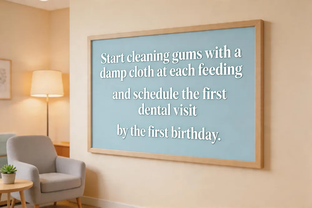 Begin cleaning a baby's gums with a damp washcloth right each feeding, even before the first tooth appears. Schedule the first dental visit within six months of the first tooth erupting or by the child’s first birthday, whichever comes first. Use a soft‑bristled, child‑size toothbrush with a small head. These simple steps set the foundation for a lifetime of healthy smiles.