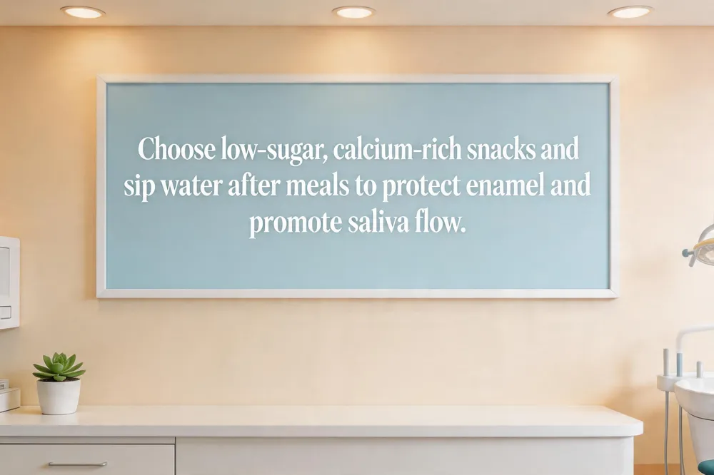 Limiting sugary and starchy snacks reduces the fuel for cavity‑causing bacteria, while calcium‑rich foods help build strong enamel. Tooth‑friendly options include fresh fruits, crunchy vegetables, cheese sticks, plain yogurt, and whole‑grain crackers—foods low in fermentable sugars that also stimulate saliva. Calcium is essential for tooth development; you can find it in dairy products (milk, cheese, yogurt), fortified plant milks, leafy greens such as kale and broccoli, and fortified cereals.