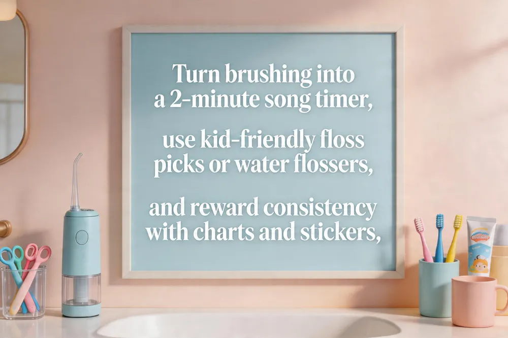 At our pediatric office we turn oral‑care into a game. To guarantee the full two‑minute brush, we recommend playing a favorite song that lasts two minutes, setting a kitchen timer, or using a smart‑timer electric toothbrush that buzzes every 30 seconds. This predictable rhythm keeps kids engaged and ensures plaque‑free teeth. For flossing, child‑friendly floss picks, pre‑threaded flossers, and even gentle water flossers make interdental cleaning easy for small hands and those with braces. Electric brushes with soft, small heads and built‑in timers are safe for children; we supervise until they can handle the brush independently, usually around age 7‑8. Our practice also provides colorful reward charts and stickers, letting families track daily brushing and celebrate milestones. These tools, combined with our personalized guidance, fluoride varnish, sealants, and a welcoming, anxiety‑free environment, give busy families a simple, effective way to protect their child’s smile. Visit us today to start the fun routine!