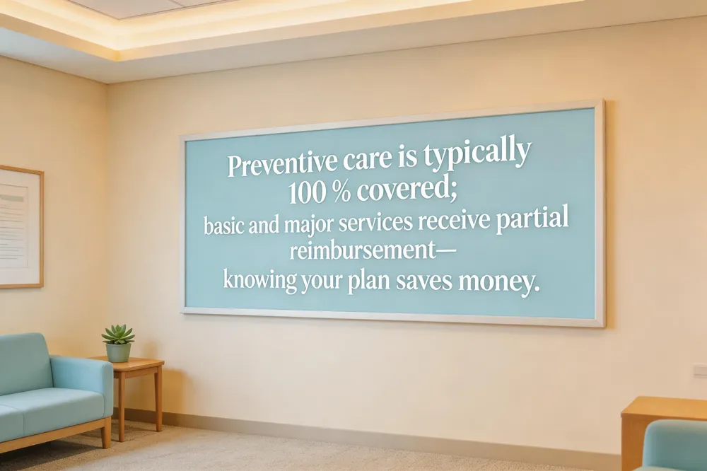 Dental insurance is organized into three tiers of care. Preventive services—routine cleanings, exams, X‑rays and sometimes sealants—are usually covered at 100 % when you see an in‑network dentist. Basic procedures such as fillings, extractions, root canals and gum‑disease treatment are partially reimbursed, typically 70‑80 % after any deductible. Major services—including crowns, bridges, dentures and inlays—receive a lower payout, often 40‑60 % of the fee, and are subject to an annual maximum benefit. Most plans also include a modest yearly deductible and a copay or coinsurance for each visit.