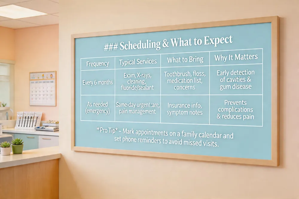 | Every 6 months | Exam, X‑rays (if needed), cleaning, fluoride/ sealant for kids | Toothbrush, floss, medication list, concerns | Early detection of cavities & gum disease |