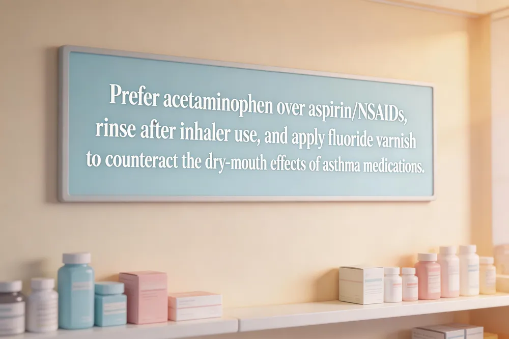At our pediatric dental office we prioritize safe medication choices for children with asthma. Avoid aspirin and certain NSAIDs – these can provoke bronchospasm, especially in kids with aspirin‑exacerbated respiratory disease, so we recommend acetaminophen for pain relief. Preferred pain reliever: acetaminophen (Tylenol) is the first‑line option because it does not trigger asthma attacks, unlike ibuprofen or aspirin. Symbicort and oral health: the inhaled corticosteroid/bronchodilator combo (budesonide/formoterol) may leave residue on teeth, causing dry mouth, gum irritation, increased bacterial growth, and a higher risk of cavities or oral thrush. Rinsing with water or brushing after each puff, using a spacer, and regular fluoride varnish applications protect enamel. Managing drug‑induced dry mouth: we educate families on rinsing, sugar‑free gum, and staying hydrated; our office offers fluoride toothpaste, sealants, and gentle cleanings using state‑of‑the‑art technology. Schedule a visit to keep your child's smile healthy while their asthma is well‑controlled.