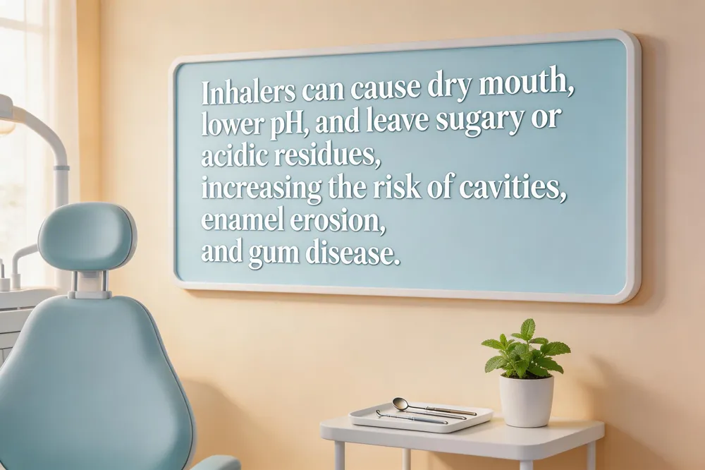 Asthma inhalers can dry the mouth (xerostomia), lower saliva pH, and leave sugary or acidic residues that promote plaque, enamel erosion, and gum disease.