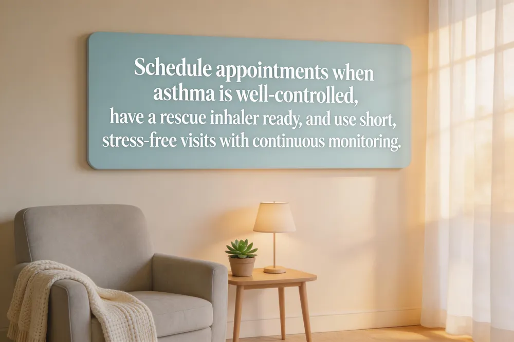 Dental considerations for asthmatic patients – Appointments are scheduled when asthma is well‑controlled, early in the day or late afternoon, and we employ calming techniques and short, stress‑free visits to reduce anxiety‑triggered attacks.