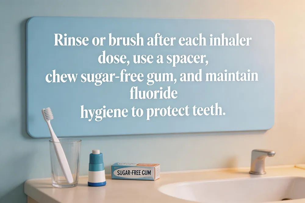 Do inhalers ruin teeth? – They don’t destroy teeth, but they raise decay risk. Simple steps—mouth‑rinse, hydrated water, sugar‑free gum, and twice‑daily fluoride brushing—protect the smile. Preventive strategies such as fluoride varnish applications, topical fluoride gels, and professional cleaning can further protect the teeth of children on long‑term asthma therapy.