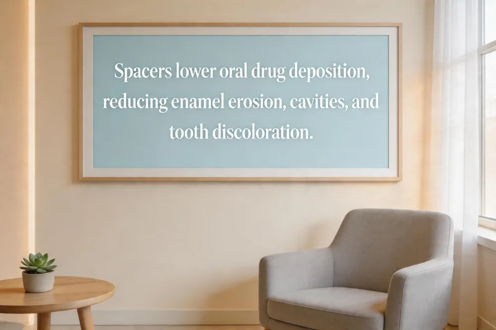 A spacer creates a holding chamber that slows the aerosol plume, allowing most of the medication to reach the lungs instead of settling on teeth and oral mucosa. This reduces direct drug deposition, lowers exposure to acidic or sugary particles, and minimizes saliva‑drying effects, thereby protecting enamel and gingival tissues. Our clinic recommends using a spacer for all metered‑dose inhalers and offers counseling on proper technique.