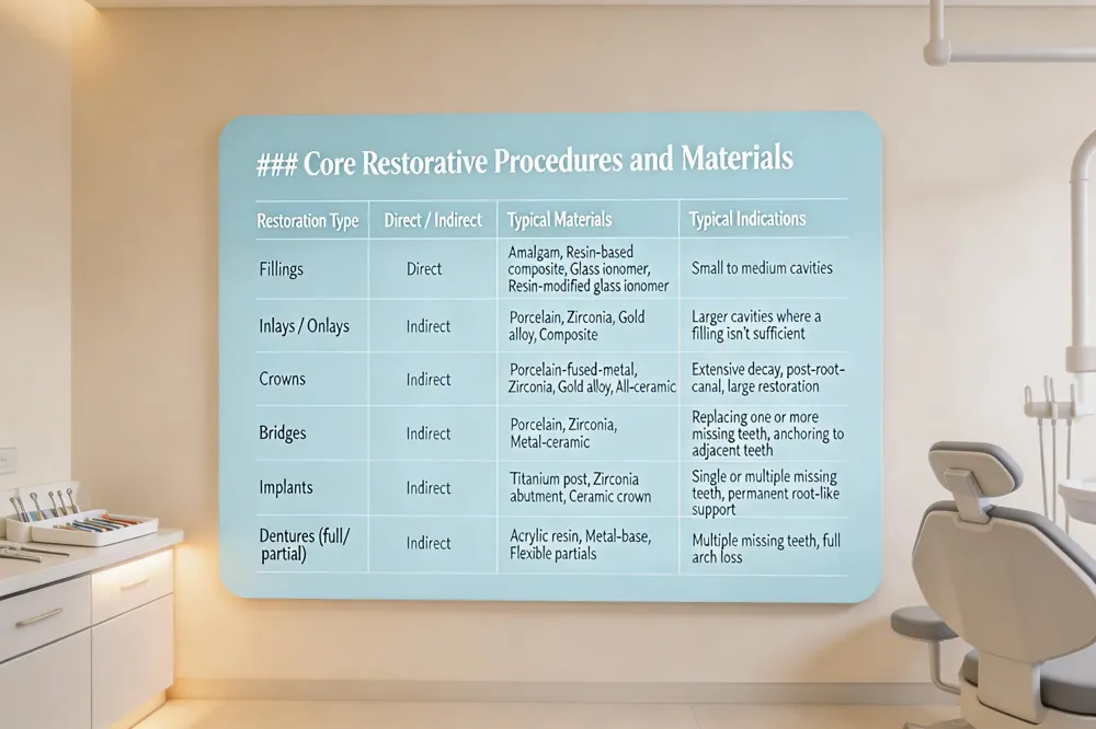 Dental restoration materials are classified into direct and indirect types. Direct materials—amalgam, resin‑based composites, glass ionomers, and resin‑modified glass ionomers—are placed directly into cavities. Indirect materials—gold alloys, porcelain or other ceramics, zirconia, and titanium—are fabricated in a lab or CAD/CAM unit and then cemented or bonded to the tooth for crowns, bridges, Inlays and onlays, and implants. Selection balances biocompatibility, strength, wear resistance, aesthetic match, and cost, based on the restoration’s location, functional demands, and patient preferences.