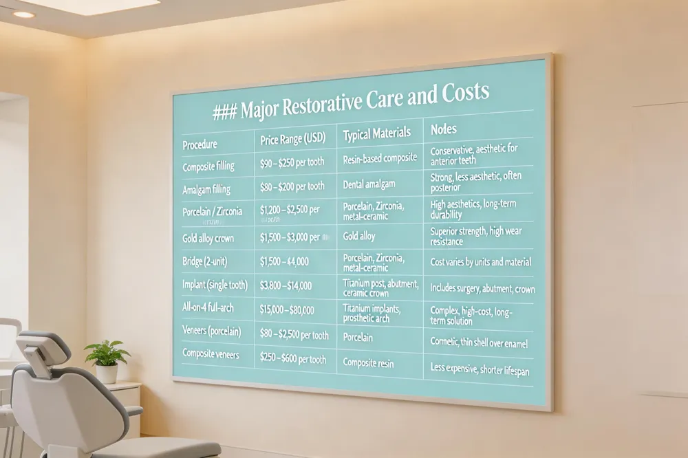 Price ranges for various restorations vary widely. A simple composite filling typically costs $90–$250 per tooth, while a porcelain or zirconia crown runs $1,200–$2,500. Bridges can range from $1,500 to $16,000 depending on the number of units and whether they are implant‑supported. Dental implants—including the titanium post, abutment, and crown—start around $3,800 for a single tooth and can exceed $14,000 for an all‑on‑4 arch. Full‑mouth reconstructions may run $15,000–$80,000, reflecting the complexity and materials used.