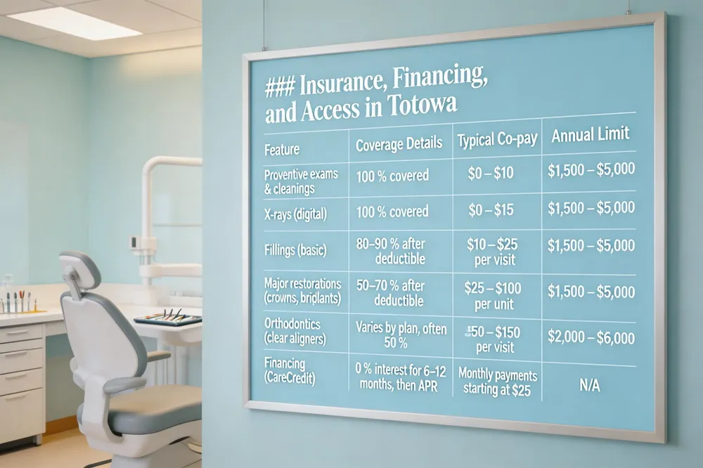 | Residents of Totowa have a wide range of options for dental insurance and financing that make restorative care both affordable and convenient. Best Choice Dental insurance offers family‑oriented PPO and indemnity plans with low co‑pays (e.g., $10 for cleanings, $25 per visit) and annual limits from $1,500 to $5,000. Most plans cover routine exams, X‑rays, and major restorative procedures such as crowns, bridges, and implants, with no waiting period for basic services and only a six‑month wait for some intermediate work. |