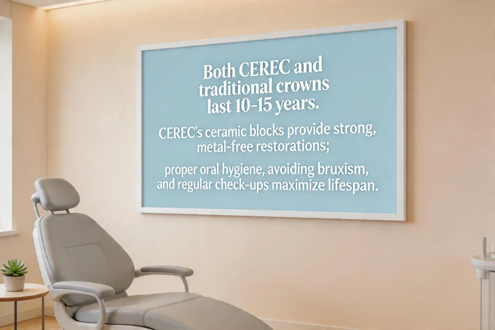 CEREC same‑day crowns typically last 10 to 15 years, matching the lifespan of traditional metal‑ or porcelain‑fused‑to‑metal crowns. Their durability comes from high‑strength ceramic blocks—lithium disilicate or zirconia—milled from a solid piece and bonded with a light‑cured resin. To maximize longevity, patients should avoid grinding or clenching, maintain diligent oral‑hygiene, and schedule six‑month check‑ups; a night‑guard may be advised for bruxism.