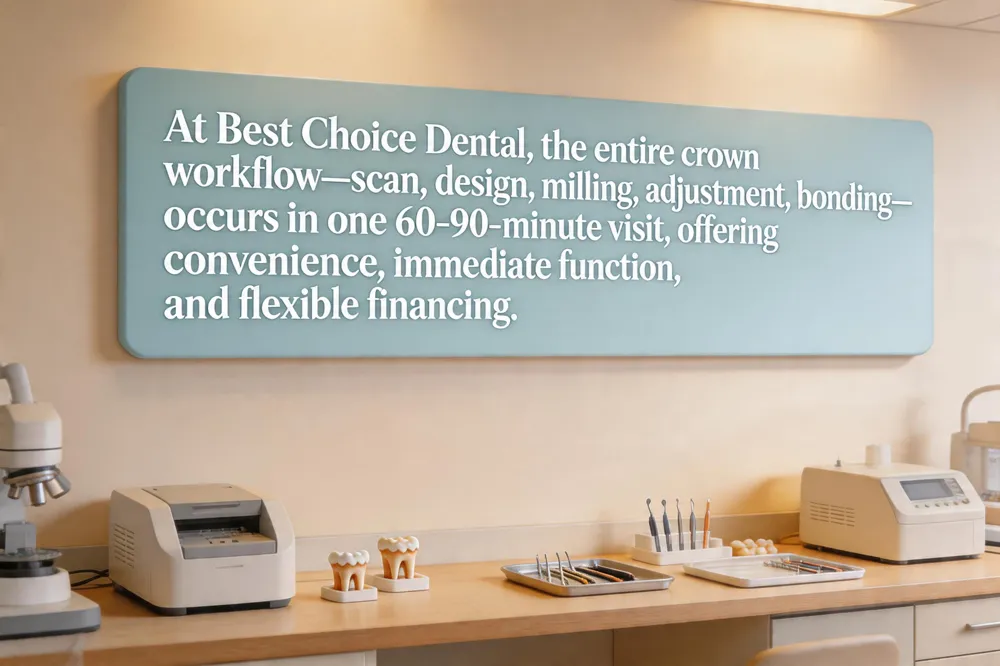 At Best Choice Dental in Totowa, NJ, we combine modern technology with personalized care to make crown treatment as smooth as possible. Dentist‑made crowns and in‑office capabilities – While most traditional crowns are fabricated by an external laboratory, our CEREC system lets us design, mill, and place a high‑strength ceramic crown right in the office. The crown is produced by a CAD/CAM milling unit, not by hand‑craft, which but the the still can expect a‑ compiled” restoration in a single visit. Scheduling and patient convenience – Because the entire workflow (digital scan, virtual design, milling, and final placement) occurs during one appointment, patients avoid the inconvenience of multiple trips, temporary crowns, and the dietary restrictions that come with them. Typical chair‑time is 60‑90 minutes, allowing patients to return to work or school the same day. Insurance and financing options – Most dental insurance plans cover CEREC crowns at the same rate as traditional crowns, as both are classified as permanent restorations. Our staff works with each patient to verify benefits, and we offer flexible financing to offset the modest premium for the premium ceramic block and digital equipment. Material selection guidance – We discuss the advantages of all‑ceramic CEREC crowns (natural esthetics, metal‑free, excellent translucency) versus traditional lab‑fabricated options that may include metal‑ceramic or gold for high‑stress posterior teeth. By evaluating bite forces, aesthetic goals, and any metal sensitivities, we help patients choose the material that best fits their clinical needs and budget.