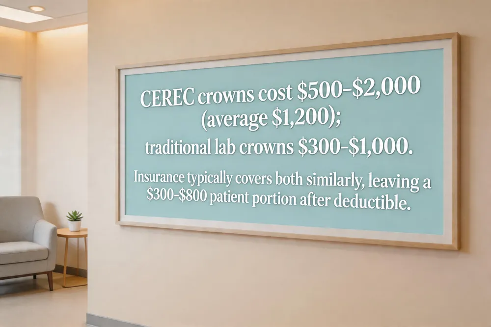 CEREC crowns are typically priced between $500 and $2,000 per tooth, with most patients paying about $1,200 on average. Out‑of‑pocket costs usually fall in the $800‑$1,500 range when you have no insurance, depending on the ceramic material (lithium disilicate, zirconia, or porcelain) and the amount of preparatory work required. Traditional lab‑fabricated crowns are generally less expensive, ranging from $300‑$1,000 for all‑ceramic or metal‑ceramic options, because the material and laboratory fees are lower.