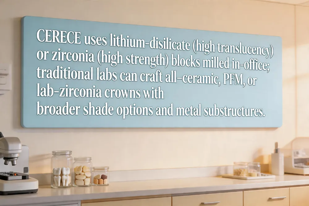 CEREC crowns are milled chair‑side from solid ceramic blocks, most commonly lithium‑disilicate (E.Max) for superior translucency and zirconia for high strength. Because the material comes from a single block, the restoration can be bonded with a light‑cured resin, giving a precise, metal‑free fit in one visit. Lab‑fabricated porcelain crowns, on the other hand, are built up layer‑by‑layer in a dental laboratory and usually require two or more appointments with a temporary crown in place. They can be all‑ceramic or porcelain‑fused‑to‑metal (PFM), offering a broader range of shades and the option of a metal substructure for added durability in heavy‑load molars.