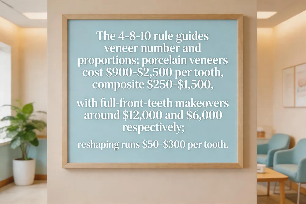 The 4‑8‑10 rule is a cosmetic‑dentistry guideline that helps determine both the number of veneers needed and the ideal tooth proportions for a natural‑looking smile. It suggests treating four teeth (typically the central incisors), eight teeth (the four front teeth on each arch from canine to canine), or ten teeth when the veneers extend to the first premolars. The rule also defines preferred widths: central incisors around 4 mm, lateral incisors about 8 mm, and canines roughly 10 mm. Using this guideline prevents an overly “perfect” look while creating balanced, symmetrical proportions. The exact number and dimensions are always customized to each patient’s anatomy and aesthetic goals.
