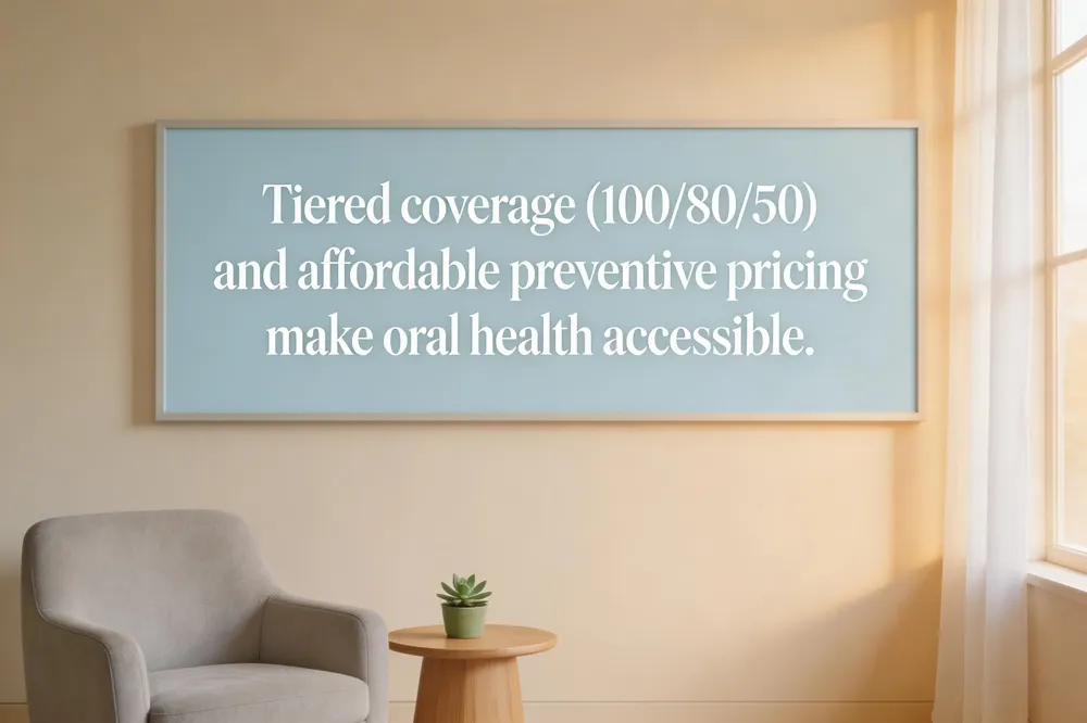 Understanding the cost of oral health care helps patients make informed decisions and keep smiles healthy. Most dental insurance plans follow a tiered coverage model: preventive services such as routine exams, cleanings, X‑rays and fluoride treatments are paid at 100 % after any deductible, basic restorative work (fillings, simple extractions, root canals) is covered at roughly 80 %, and major procedures (crowns, bridges, dentures, extensive gum therapy) are reimbursed at about 50 %. This structure encourages regular check‑ups which can catch problems early and avoid expensive emergency treatment.