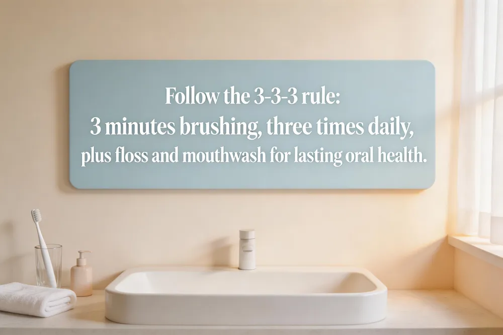 A strong oral‑health routine starts with simple, repeatable steps. The 3‑3‑3 rule is a daily guide that helps families keep teeth and gums healthy. It calls for three minutes of brushing three times a day—after breakfast, lunch, and before bedtime—followed by a three‑step sequence of brushing, flossing (or cleaning between teeth when they touch), and, when recommended, a fluoride mouth rinse. Finally, replace your toothbrush or electric brush head every three months to maintain effective bristles and protect gums.