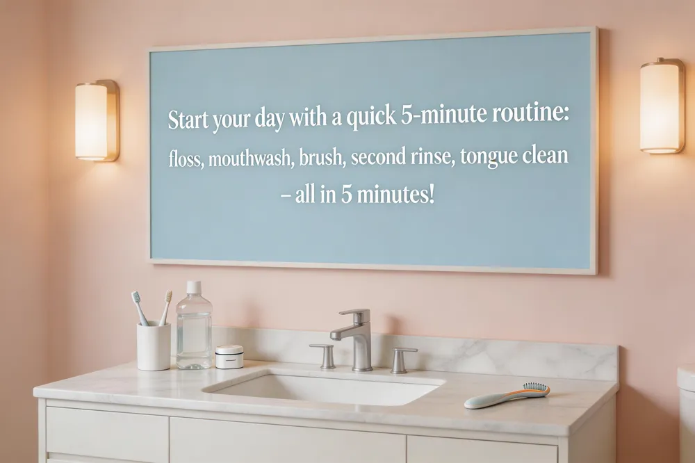 A five‑minute oral‑care routine fits busy families while still delivering professional‑level results. Use a soft‑bristled or electric toothbrush with a built‑in timer to brush for two minutes, covering all quadrants and the tongue, then spend one minute flossing with a C‑shape motion or a water flosser. Finish with a 30‑second alcohol‑free antimicrobial or fluoride mouthwash to lower bacterial load and freshen breath. This concise schedule removes plaque, reduces cavities and gum disease, and supports systemic health by lowering inflammation linked to heart disease and diabetes. By pairing the routine with everyday cues—brushing while waiting for coffee, flossing during a TV break, and keeping supplies visible on the bathroom counter—parents model good habits and make oral hygiene a seamless part of daily life.