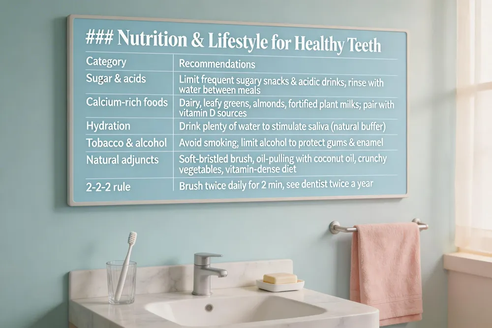 Diet matters too: limit sugary and acidic foods and drinks, stay well‑hydrated with water, and choose calcium‑rich dairy, crunchy fruits, and leafy vegetables that stimulate saliva and help neutralize acids.