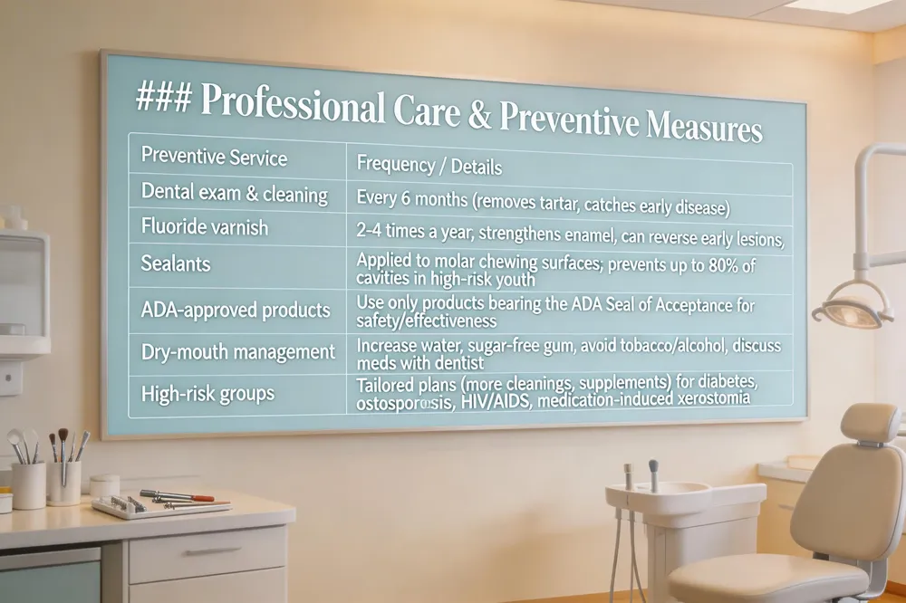 Fluoride varnish and sealants – Fluoride varnish applied 2–4 times a year strengthens enamel and can reverse early lesions; sealants on molar chewing surfaces prevent up to 80 % of cavities in high‑risk children and teens.