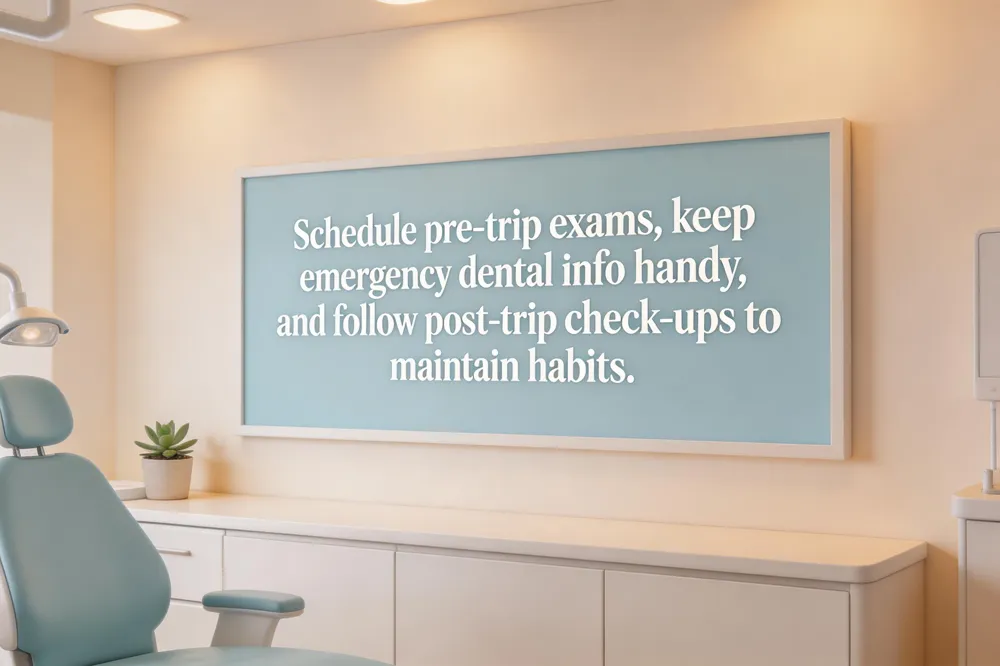 Prepare an emergency plan by keeping the dentist’s phone number and a copy of your child’s dental records in your travel bag. A compact travel kit (soft‑bristled toothbrush, fluoride toothpaste, floss picks, and sugar‑free gum) lets you maintain the twice‑daily, two‑minute brushing routine even on the road. If a problem arises, a quick call to our office can arrange a tele‑consultation or direct you to a trusted local provider.