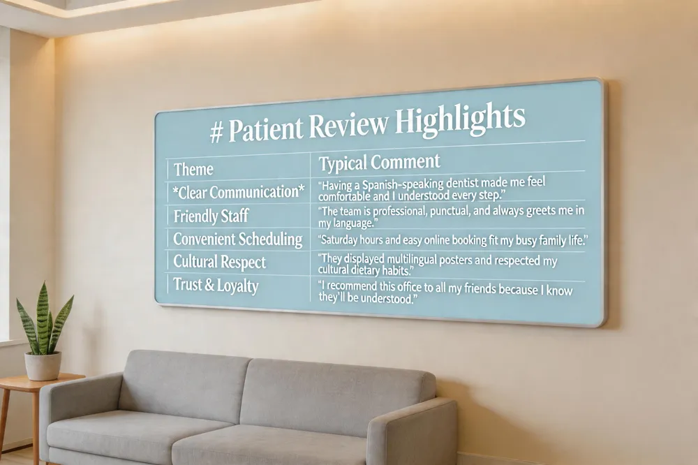 | Clear Communication | “Having a Spanish‑speaking dentist made me feel comfortable and I understood every step.” |