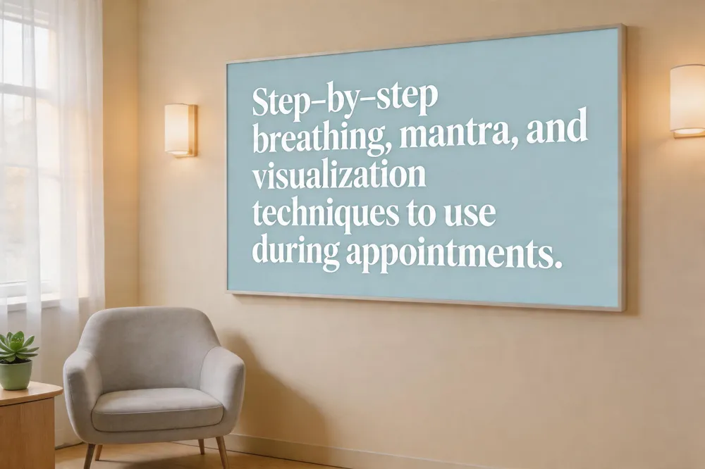 A simple, effective mantra is: “I need a check‑up, and it’s going to be fine.” Repeat it slowly, syncing each phrase with an inhale and exhale, while imagining yourself relaxed and smiling. The repetition reinforces a sense of safety and keeps the mind focused away from fear.