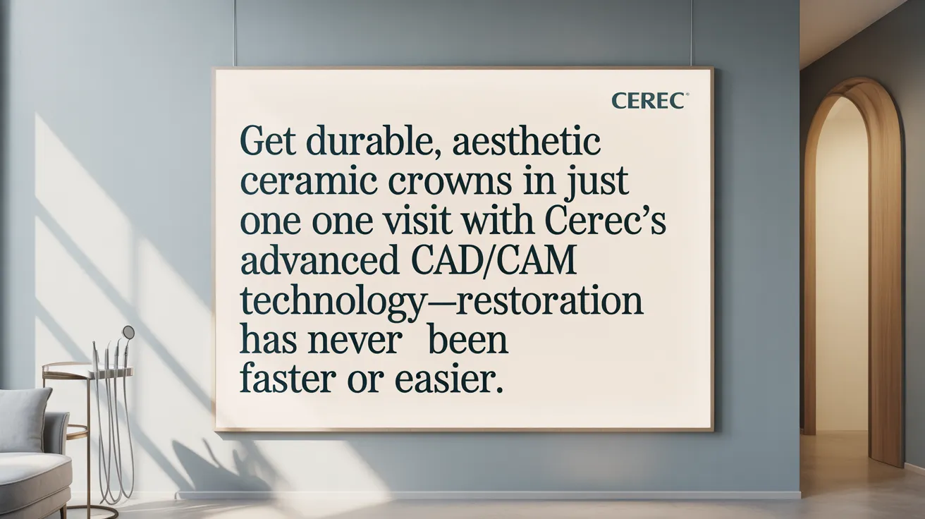 CEREC crowns use advanced CAD/CAM technology to create and place a custom dental crown in a single office visit, often within 60 to 90 minutes. This same-day dental crowns solution eliminates the traditional multiple-appointment process of taking impressions, creating temporary crowns, and waiting weeks for lab fabrication.