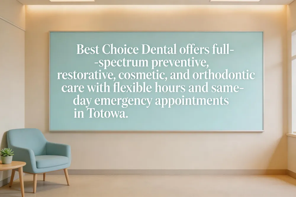 Totowa Family Dental Totowa Family Dental is the family‑focused branch of Best Choice Dental, providing comprehensive preventive, restorative, and cosmetic care for patients of all ages. Services range from routine cleanings and sealants for children to Invisalign, veneers, and dental implants for adults. The office, conveniently situated on Route 46 West, offers flexible scheduling, including early morning and weekend appointments. Call (973) 890‑8811 to join the dental family.