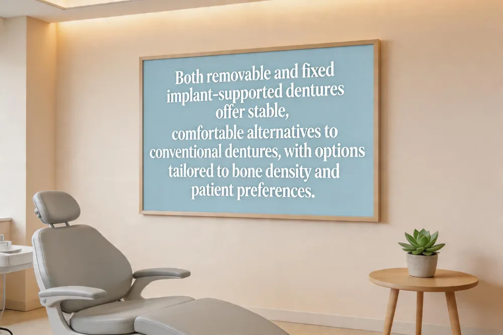 Are implant‑supported dentures removable?** Yes. Many designs—overdentures and snap‑on dentures—attach to implants with clips or magnetic attachments, allowing patients to remove them for cleaning without adhesives. Fixed hybrid options (e.g., All‑on‑4) remain permanently affixed and require professional removal only.