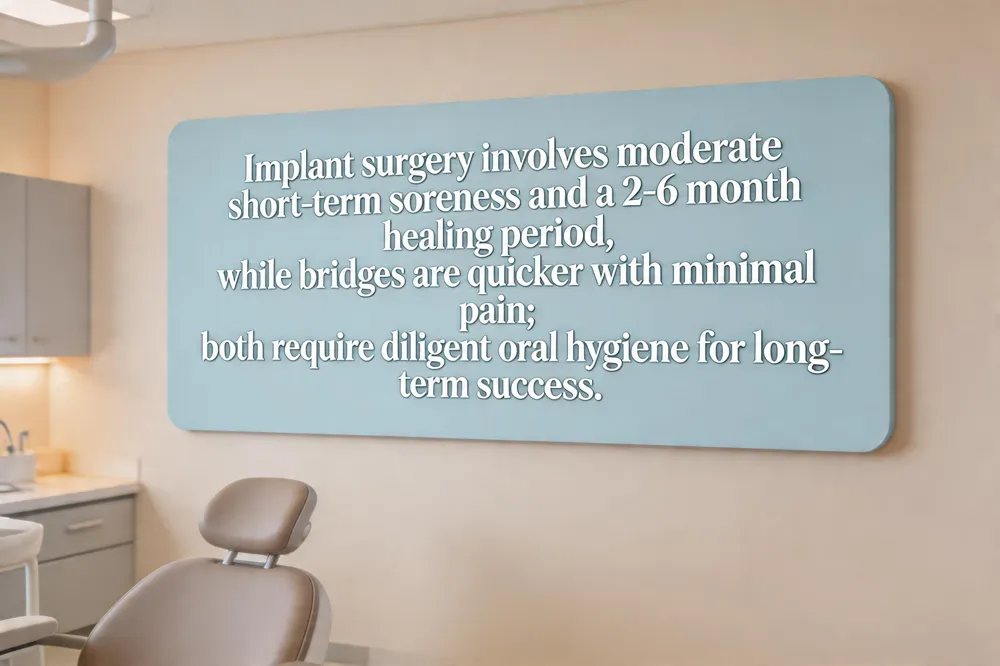 Implant placement is a surgical procedure, so patients usually feel moderate soreness, swelling, and bruising for a few days, while a traditional bridge involves only tooth preparation and cementing, resulting in mild sensitivity and minimal pain. Healing after an implant requires 2–6 months of osseointegration before the final bridge is attached; a bridge can be completed in two visits within weeks. Daily oral hygiene for both includes brushing, flossing, and using floss threaders or water flossers under the pontic, but implants also demand careful monitoring of the surgical site. Long‑term, implants preserve bone, protect neighboring teeth, and can last a lifetime, whereas bridges are quicker, less expensive up‑front, but may need replacement every 5‑15 years and can compromise adjacent teeth. At Best Choice Dental in Totowa, NJ, we combine digital imaging, 3D‑printed prosthetics, and personalized care to make either option as comfortable and durable as possible.