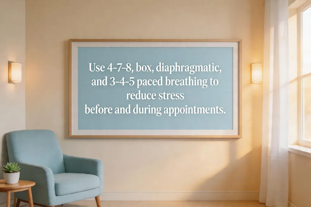 Dental visits can trigger a fight‑or‑flight response, but simple breathwork can switch your body into a calm state. The 4‑7‑8 method (inhale 4 sec, hold 7 sec, exhale 8 sec) quickly activates the parasympathetic nervous system and lowers heart rate. Box (square) breathing – inhale 4 sec, hold 4 sec, exhale 4 sec, hold 4 sec – provides a rhythmic anchor that steadies anxiety spikes during lengthy procedures. Diaphragmatic (belly) breathing expands the abdomen on the inhale, delivering more oxygen and reducing muscle tension; a hand on the belly helps ensure proper technique. The 3‑4‑5 paced breathing (inhale 3 sec, hold 4 sec, exhale 5 sec) is another easy pattern that can be practiced in the waiting room or while seated in the chair.