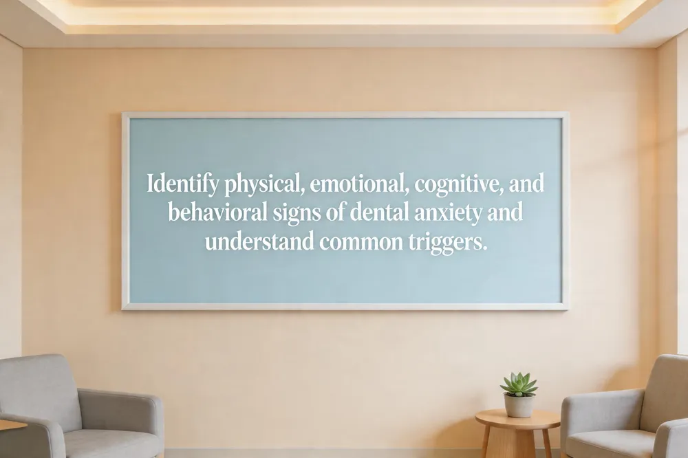 Dental anxiety often shows up with physical signs such as rapid heartbeat, sweating, trembling, shortness of breath, an upset stomach, or even a drop in blood pressure that can lead to fainting. Emotional reactions may include intense dread, panic, crying, or a feeling of being on edge that can be noticeable to others. Cognitive symptoms include racing thoughts, difficulty concentrating, and an overwhelming fear of pain or loss of control. Behaviorally, many patients avoid appointments, use humor or aggression to mask fear, or withdraw from discussion about treatment.