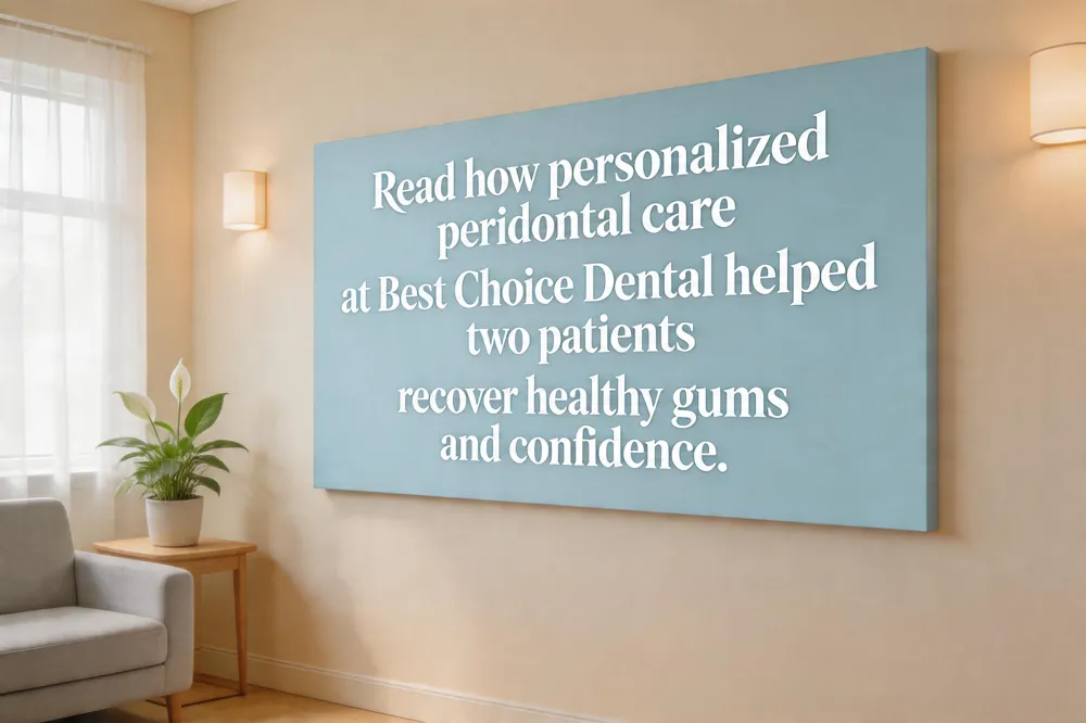 Treatment plan at Best Choice Dental: Both received comprehensive periodontal assessments, scaling and root planing, and personalized oral‑hygiene education.