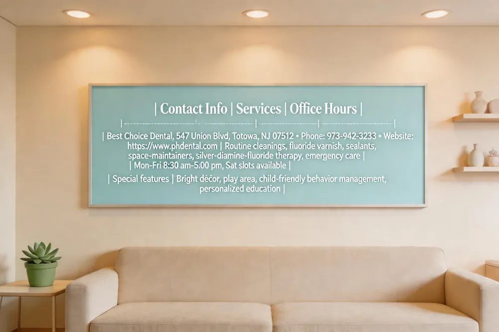 | Best Choice Dental in Totowa, NJ, is a family‑oriented practice that serves as a dental home for children from infancy through adolescence. The office is located at 547 Union Blvd, Totowa, NJ 07512, and appointments can be scheduled by calling 973‑942‑3233. Hours are Monday‑Friday 8:30 am‑5:00 pm, with Saturday slots available for busy families. |