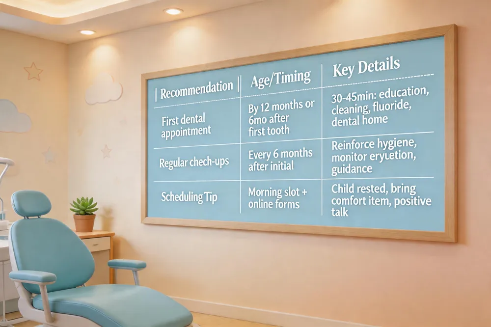 When should your child have their first dental visit? The AAPD recommends a first visit by the first birthday or six months after the first tooth appears. This brief (30‑45 minute) appointment focuses on education, a light cleaning, and fluoride protection, establishing a dental home that reduces anxiety and future treatment costs.
