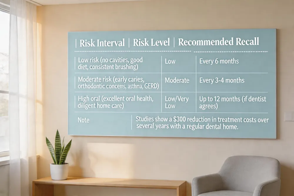 Visit intervals are risk‑based. Children with no cavities, a healthy diet, and good at‑home brushing can comfortably stay on the six‑month schedule. Those who have experienced early childhood caries, orthodontic concerns, or medical conditions (e.g., asthma, GERD) may be seen every three to four months for more intensive preventive care. Conversely, a child with excellent oral health and consistent home care might safely extend the recall to a year.