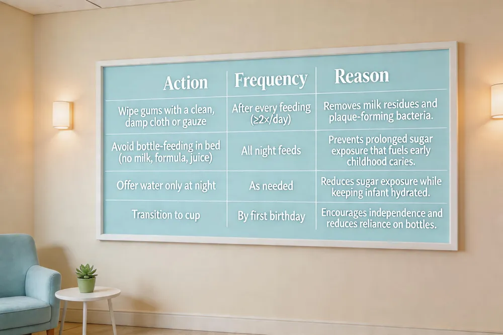 The first step in a child's oral‑health journey begins before a single tooth erupts. After every feeding, gently wipe the infant’s gums with a clean, damp cloth or gauze wrapped around your finger; doing this at least twice a day removes milk residues and plaque‑forming bacteria. Equally important is to avoid bottle‑feeding in bed—do not let a baby fall asleep with a bottle of milk, formula, or juice, as prolonged exposure to sugars fuels early childhood caries. Instead, offer water only at night and transition to a cup by the first birthday. These simple habits lay the foundation for a lifelong oral‑hygiene routine and make the first dental visit smoother. When you ask, “What oral‑care routine is recommended for infants before teeth appear?” the answer is: clean the infant’s gums after each feeding, keep nighttime bottles empty of sugary liquids, and start a gentle, consistent cleaning habit that will evolve into brushing once the first tooth arrives.