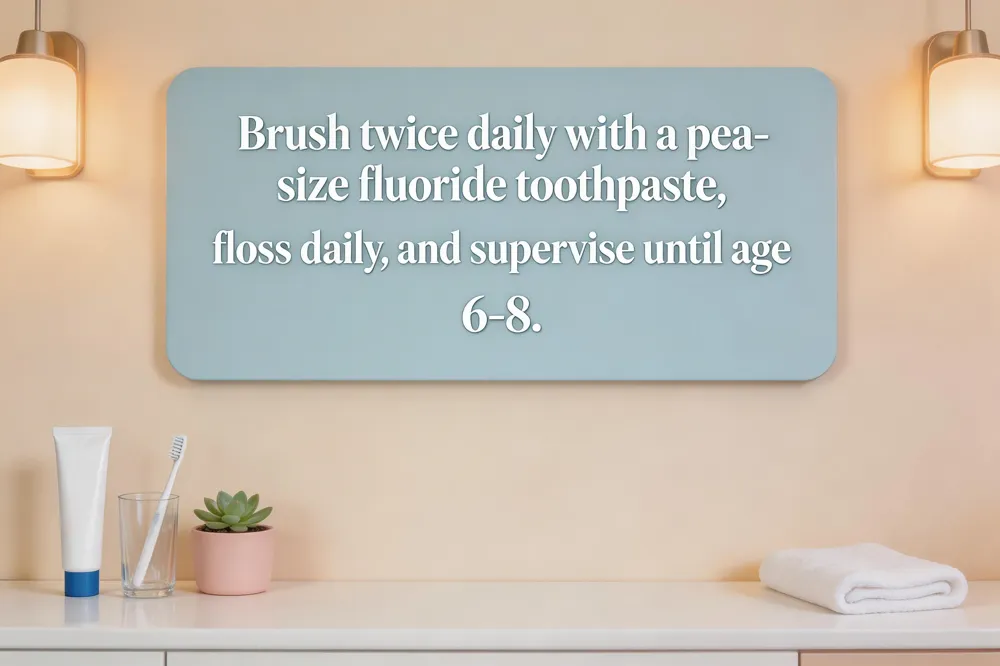 Brushing techniques – Use a soft‑bristled, age‑appropriate toothbrush and a pea‑sized amount of fluoride toothpaste for children 3 years and older (a smear of rice‑grain size for younger kids). Brush twice a day for two minutes, employing gentle circular motions and a 45‑degree angle toward the gum line. Supervise brushing until the child can reliably spit and reach all surfaces, usually by age 6‑8.