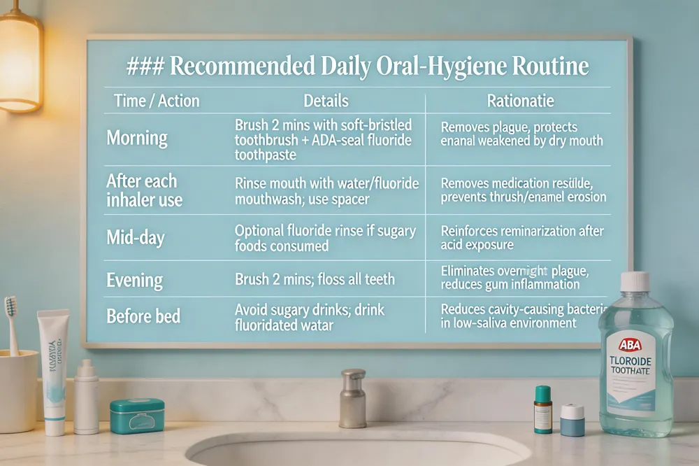 | After every inhaler use, rinse the mouth with water (or a fluoride mouthwash) and, whenever possible, use a spacer device; this removes medication residue that can erode enamel and cause oral thrush. Limit sugary drinks and snacks—especially fruit juices, sodas, and sports drinks because they feed cavity‑causing bacteria that thrive when saliva is reduced. |