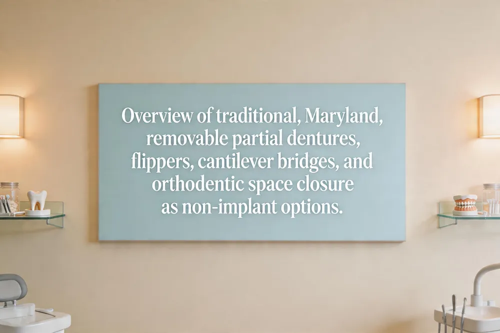 - Good implant alternative? Tooth‑supported bridges, removable partial dentures, or Maryland bridges.