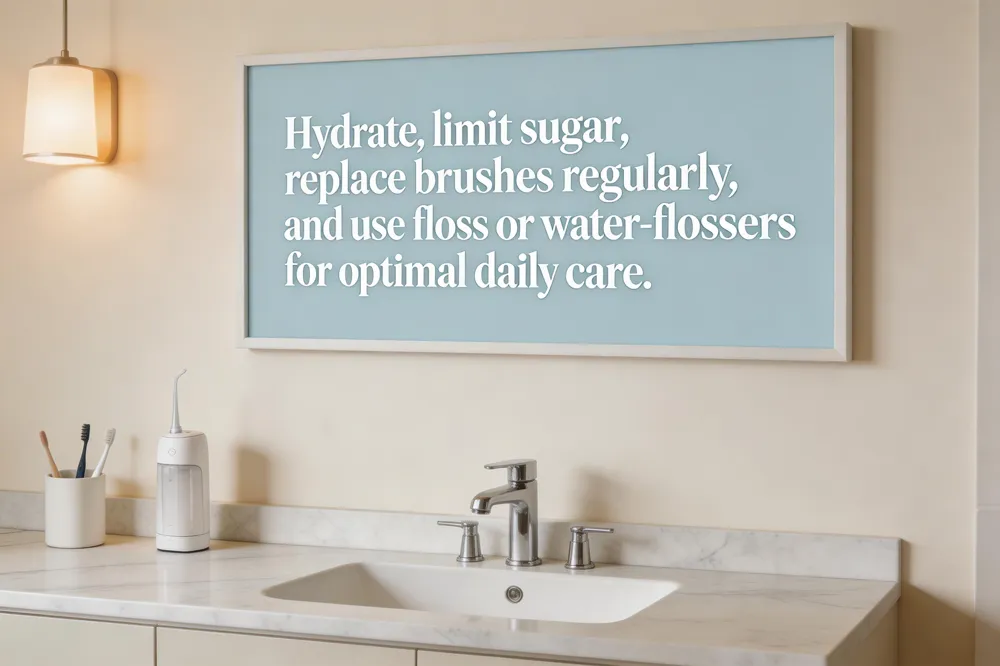 10 ways to keep your teeth healthy – Brush and replace your brush every 3‑4 months, floss or water‑floss daily, limit acidic foods, stay hydrated, chew sugar‑free gum, eat calcium‑rich foods, avoid tobacco, wear a night guard if needed, and keep bi‑annual dental visits.