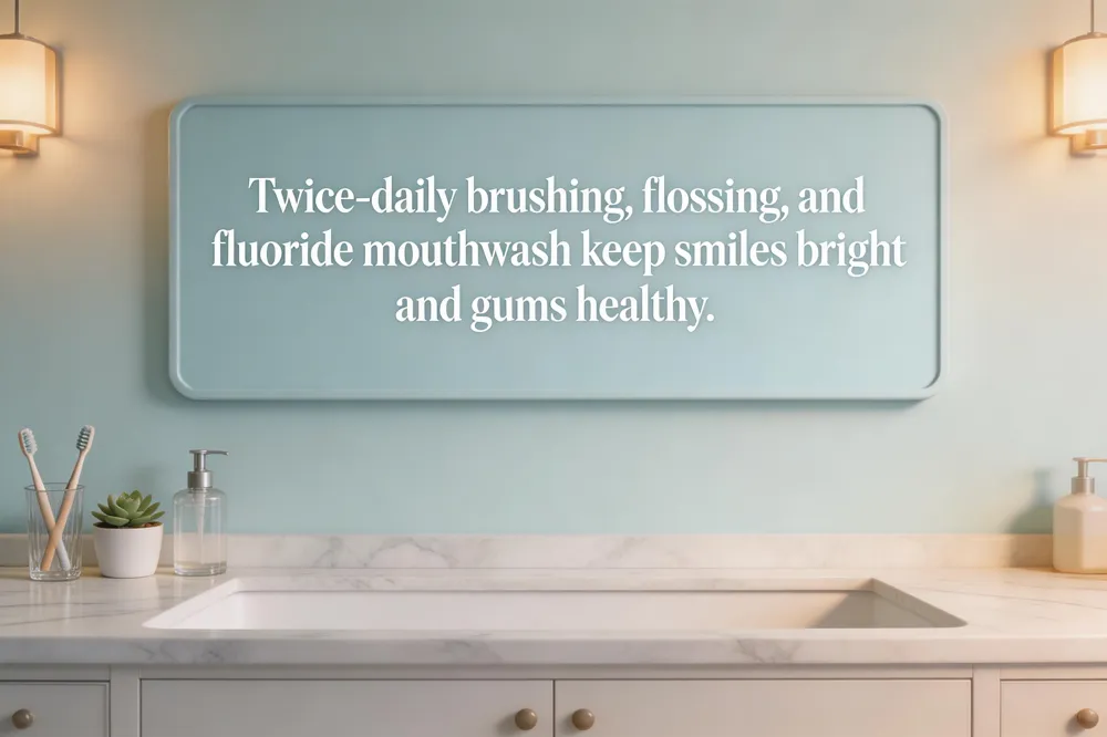Daily habits important for oral hygiene – Brush twice a day with a soft‑bristled toothbrush, fluoride toothpaste, and a 45‑degree angle for a full two minutes. Floss daily to clean between teeth and along the gum line. Rinse with an antimicrobial or fluoride mouthwash, limit sugary snacks and drinks, stay well‑hydrated, and schedule regular check‑ups at Best Choice Dental.