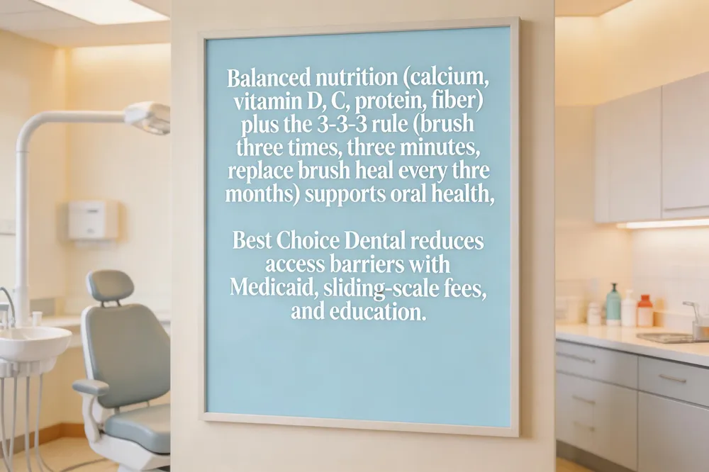 A healthy mouth and a balanced diet go hand‑in‑hand. Calcium, phosphorus, vitamin D and protein rebuild enamel, while vitamin C and vitamin A support gum tissue and healing. Fiber‑rich fruits and vegetables stimulate saliva, which neutralizes acids and washes away food particles, reducing cavities and erosion. Limiting sugary and acidic drinks is essential because they lower plaque pH and promote demineralization. The simple 3‑3‑3 rule makes daily care easy: brush three times a day (after breakfast, lunch and before bed) for three minutes each session, replace the brush head every three months, and follow a three‑step routine—brush, floss, and use a fluoride rinse if advised. Consistent brushing, flossing and fluoride‑rich water work with nutrition to keep teeth and gums strong. Access to dental care can be blocked by high out‑of‑pocket costs, limited transportation and a shortage of providers that accept public insurance. Best Choice Dental in Totowa, NJ tackles these barriers by accepting Medicaid, offering flexible scheduling, sliding‑scale fees, financing options and community outreach that educates families on preventive habits. This patient‑focused approach ensures that every family can achieve a confident, healthy smile.