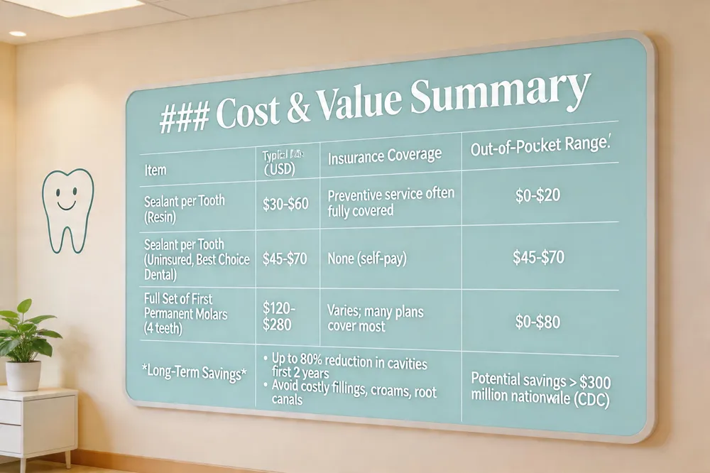 | Sealant per Tooth (Uninsured, Best Choice Dental) | $45‑$70 | None (self‑pay) | $45‑$70 |