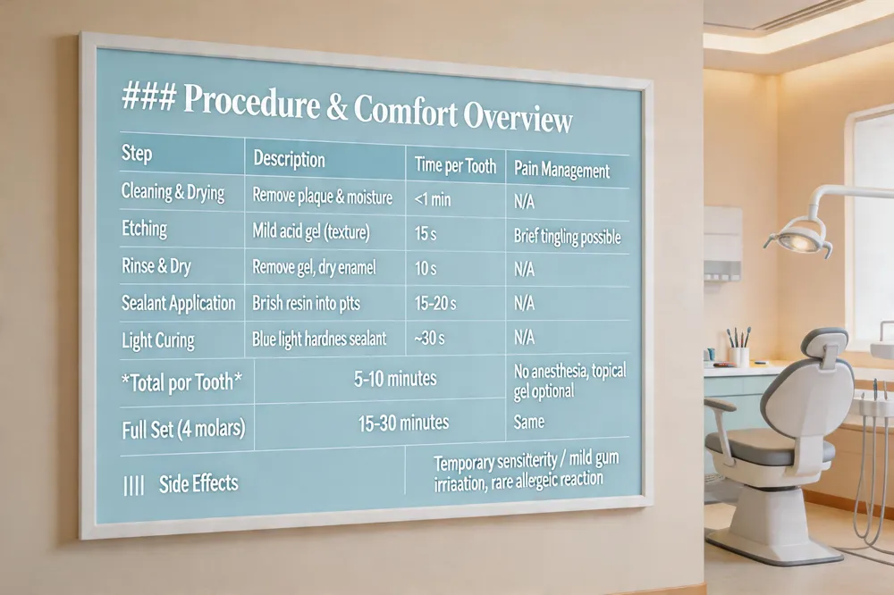 Pain management: Because the procedure involves no drilling, most children feel little discomfort. A brief tingling may occur from the etch, and a topical anesthetic gel can be used for anxious patients, but injectable anesthesia is rarely needed.