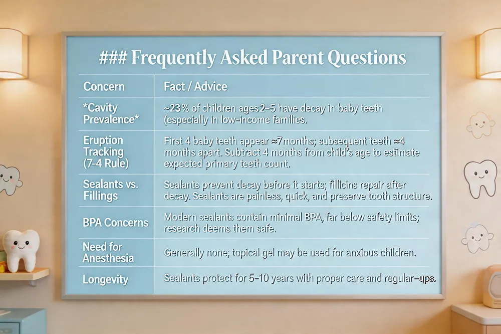| Eruption Tracking (7‑4 Rule) | First 4 baby teeth appear ≈7 months; subsequent teeth ≈4 months apart. Subtract 4 months from child’s age to estimate expected primary teeth count. |